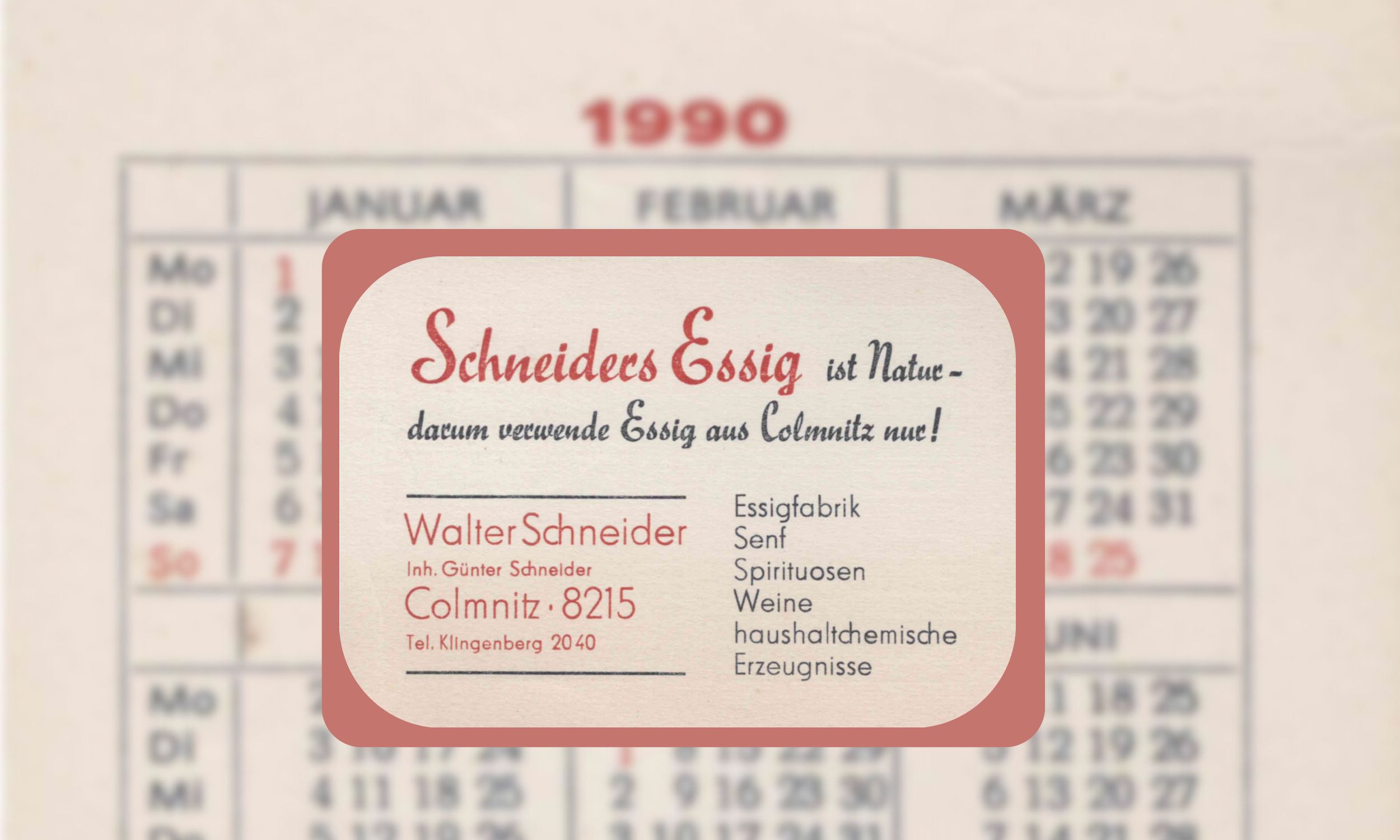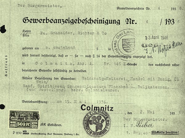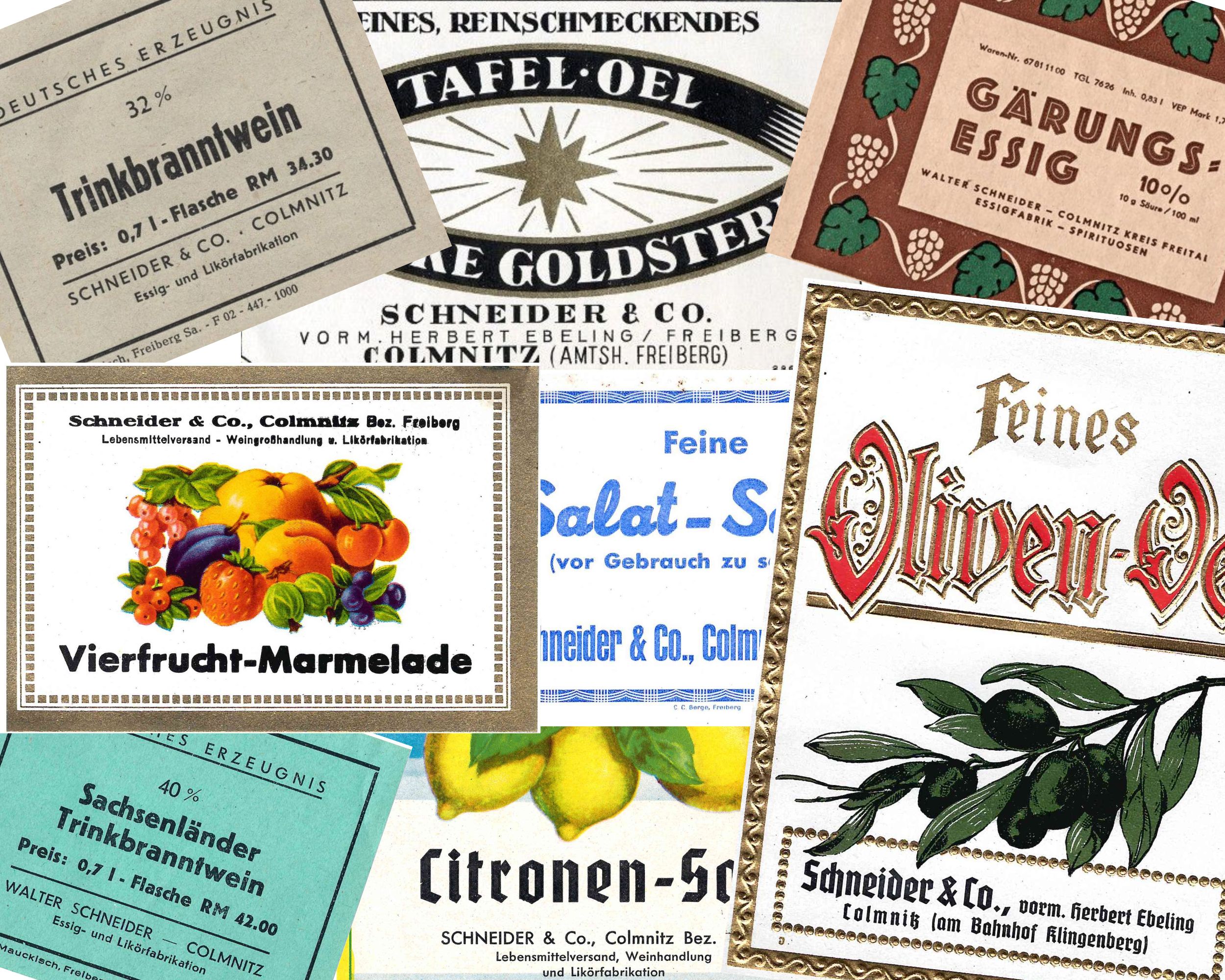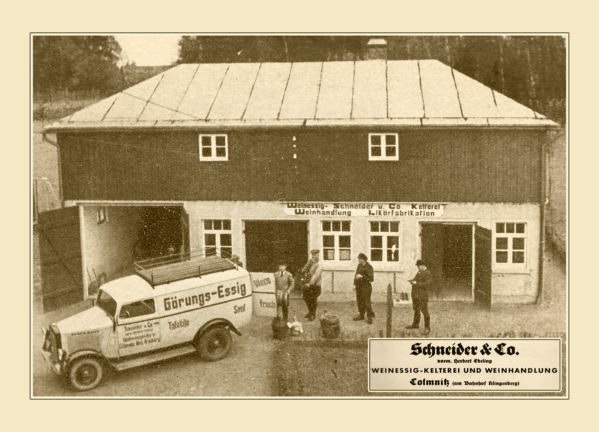 1936 – gründeten Walter Schneider – gelernter Zimmermann – und Max Richter in Colmnitz ein kleines Unternehmen „die Schneider & Co. Weinessig – Kelterei und Weinhandlung“. Von Weltbedeutung war das bestimmt nicht, doch in dieser Zeit ein gewagter Schritt. Hinter der Firma verbarg sich ein ambulanter Handel mit Lebensmittel, Senf, Essig, Olivenöl, Säften und Weinen. Schnell bekam das kleine Unternehmen vom Volksmund seinen Namen „Der Essig-Schneider“. Um Kunden im Umland zu finden, wurde mit dem Fahrrad in die umliegenden Dörfer und bis Freiberg geradelt, um den Menschen die Warenpalette anzubieten. Nach den Bestellungen wurde das Warensortiment zusammengestellt, auf einen für die damaligen Verhältnisse modernen Lieferwagen „Opel-Blitz“ verladen und ab ging es von Dorf zu Dorf. Doch nur kurze Zeit währte das Glück. Mit Kriegsbeginn wurde das Auto beschlagnahmt und so war guter Rat teuer. Doch man ließ sich nicht entmutigen, 2 Pferde mit Wagen wurden in den Dienst gestellt und so ging es weiter, wenn auch viel langsamer und mühsamer, die Kundschaften zu beliefern. Oft mussten sogar Kutscher und Pferde übernachten, weil die Wegstrecke an einem Tag nicht zu schaffen war.
