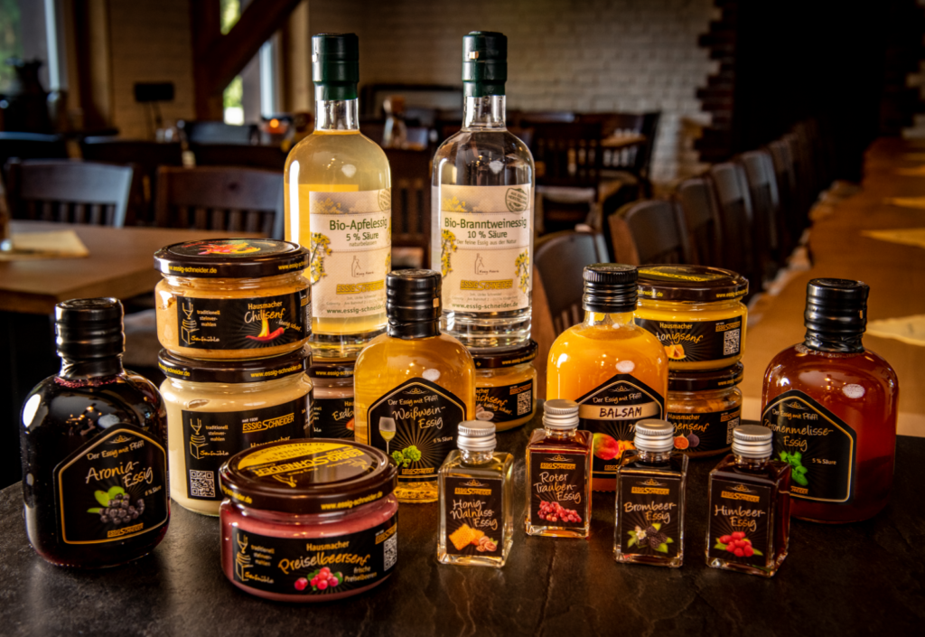Willkommen bei Essig-Schneider – einem traditionsreichen Familienunternehmen, das seit 1936 mit Leidenschaft und Hingabe für höchste Qualität steht. In unserer Essigfabrik produzieren wir eine vielfältige Auswahl an exquisiten Essigen. Schneider´s Senfvariationen werden auf drei Senfmühlen traditionell steinvermahlen. Verschiedene Spezialitäten für Genuss und Wellness ergänzen das Sortiment. Unsere Produkte sind handgefertigt und mit viel Liebe zum Detail kreiert.