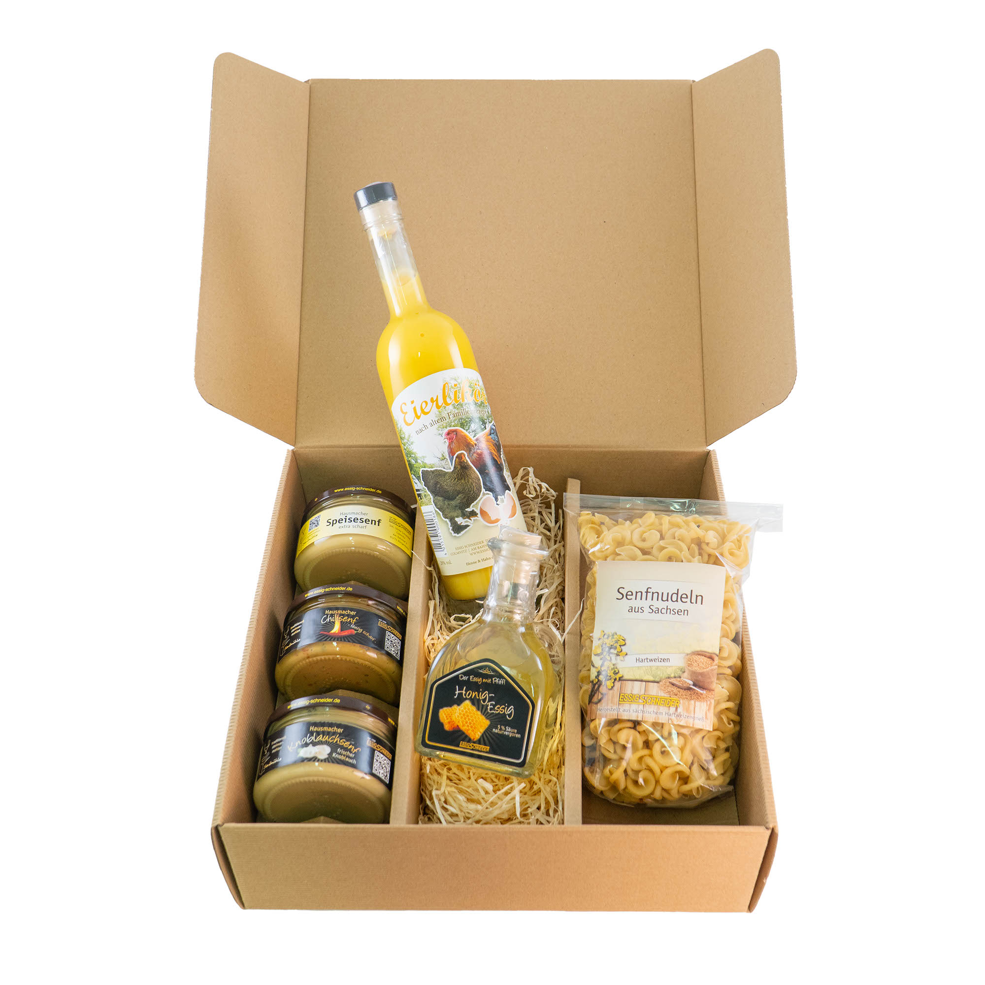 Inhalt: Speisesenf "extra scharf" 180ml, Bärlauch 180ml, Kräutersenf 180ml, Honigessig 250ml, Senfnudeln, Eierlikör 0,5l