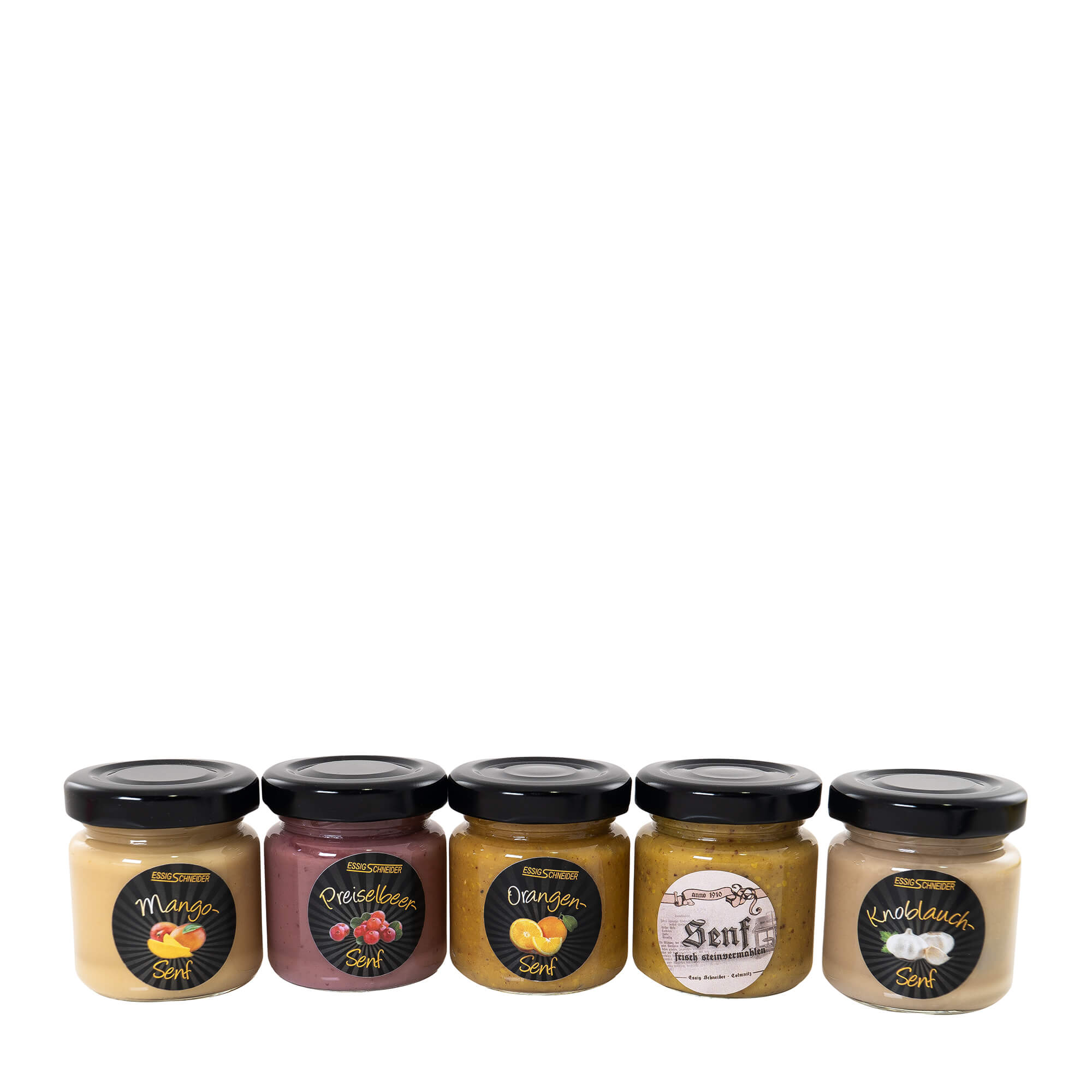 Inhalt: 5 x 50 ml Glas Mangosenf -Preiselbeersenf - Orangesenf - Anno Senf - Knoblauchsenf